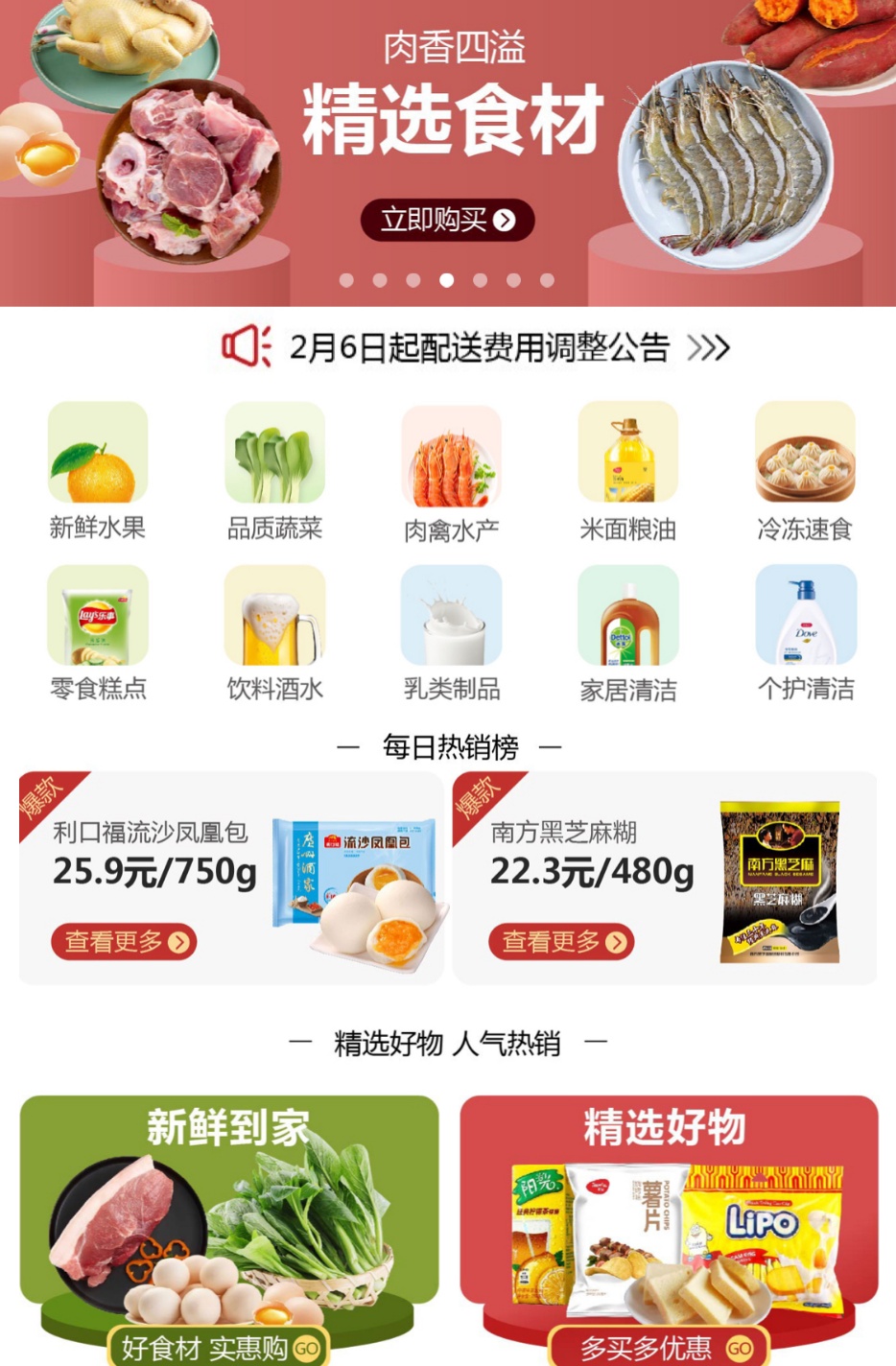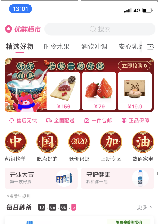 商品情況:除了生鮮日用品,母嬰用品、廚具電器都有。但春節(jié)需求旺盛,需提前搶購,可先看看自己所在地區(qū)是否提供配送。