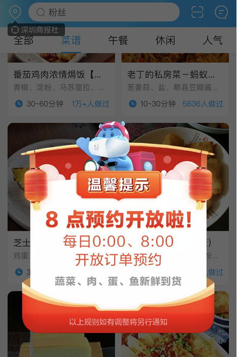 下單時間:每日0點、8點開放訂單預約。運力緊張,需提前搶購,此外,盒馬部分區(qū)域門店暫只可預約當日配送服務,若當日配送服務已約滿,會顯示“配送小哥已約滿,歡迎門店選購”。