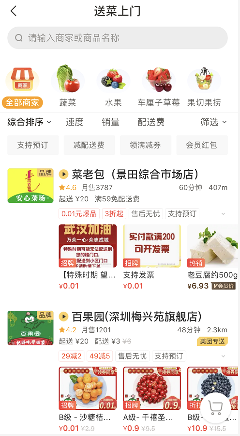 商品情況:未設買菜專區(qū),不過店鋪較多,商品豐富,市民可搜索菜品名字購買。但多家門店休息中,暫時關閉了線上派送,可先看看自己所在地區(qū)是否提供配送。