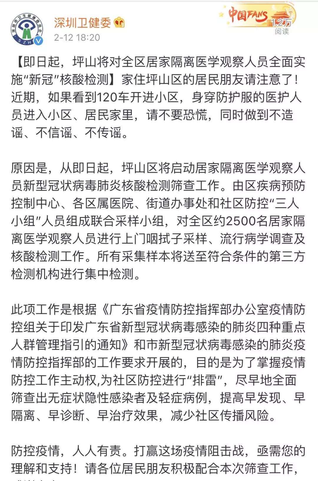 為防范新冠病毒感染疫情的社區(qū)傳播,切實做到早發(fā)現(xiàn)、早隔離、早診斷、早治療,2月12日起,深圳各區(qū)(新區(qū))均為所有居家隔離醫(yī)學觀察人員檢測新型冠狀病毒核酸。