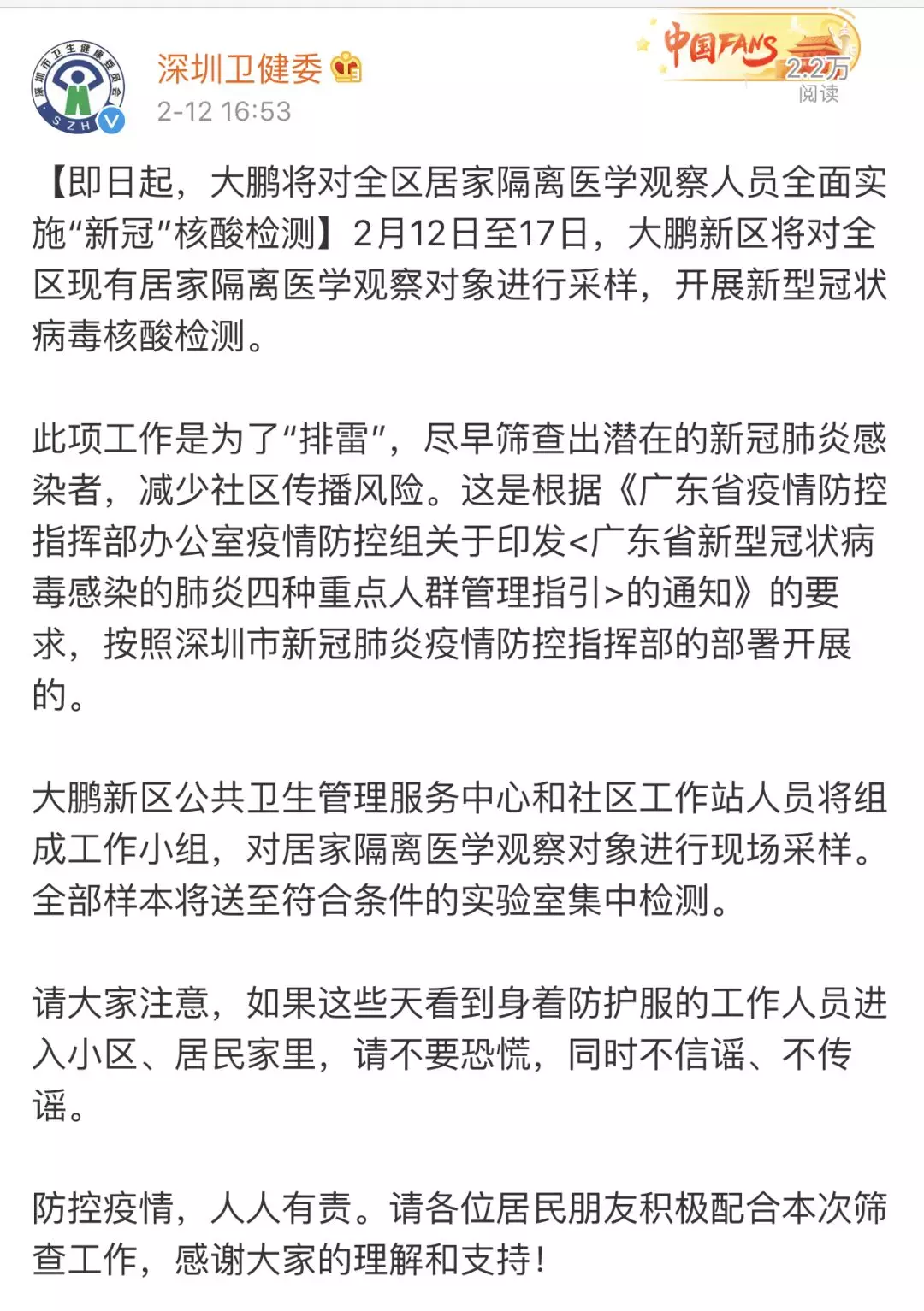 徹底“排雷”!深圳免費(fèi)為所有居家隔離者檢測“新冠”病毒核酸