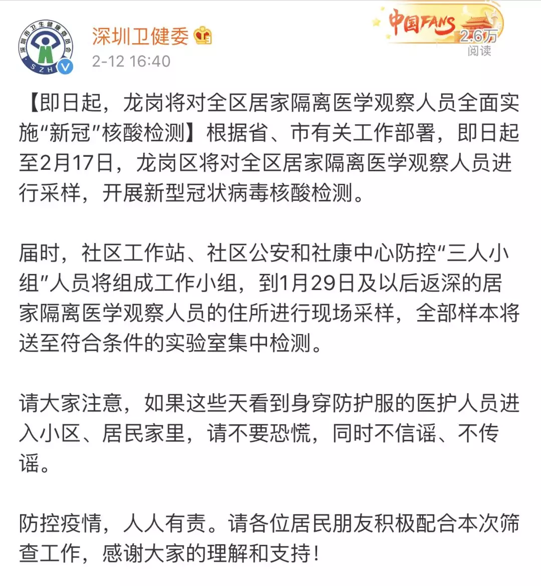 徹底“排雷”!深圳免費(fèi)為所有居家隔離者檢測(cè)“新冠”病毒核酸