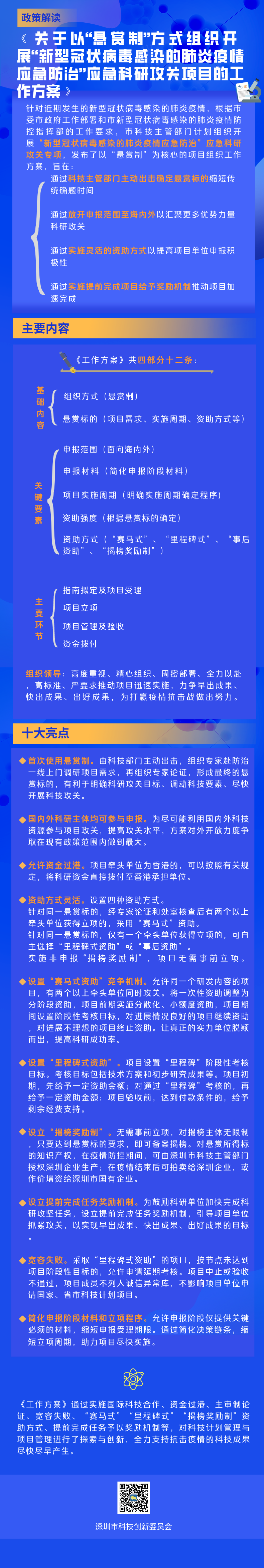 據(jù)悉,該方案首次使用懸賞制,由科技部門主動出擊,組織專家赴防治一線上門調(diào)研項(xiàng)目需求,再組織專家論證,形成最終懸賞標(biāo)的。深圳市科創(chuàng)委相關(guān)負(fù)責(zé)人表示,以“懸賞”為方案核心有利于明確科研攻關(guān)目標(biāo)、調(diào)動科技要素、盡快開展科技攻關(guān)。此外,為盡可能利用國內(nèi)外科技資源參與項(xiàng)目攻關(guān),提高攻關(guān)水平,方案對外開放力度爭取在現(xiàn)有政策范圍內(nèi)做到最大,國內(nèi)外科研主體均可參與申報。