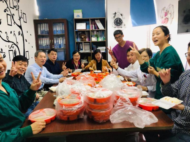 20:40,院領(lǐng)導(dǎo)和專家剛剛討論會(huì)診結(jié)束,病房同事也剛剛完成輪換交接。配餐室突然多了好多人,大家好像約好的似的,都不愿意回去自己過年。我們相聚一起,不分上下級(jí),我們只是一群同事(其實(shí),劉映霞副院長也在)一起吃除夕工作餐,一起過大年。