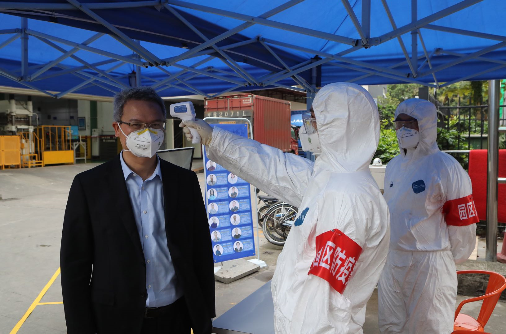 記者驅(qū)車來到該公司園區(qū)門口時(shí),就可以見到工作人員正在對(duì)進(jìn)入園區(qū)的車輛進(jìn)行消殺,在門口,還有多個(gè)海報(bào)上寫著進(jìn)入園區(qū)后的一些注意事項(xiàng),例如在公司就餐的注意事項(xiàng)、自覺接受體溫測(cè)量和注意佩戴口罩等。