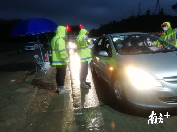 “富地崗防疫檢查點(diǎn)地理位置受限,條件相對(duì)艱苦。但我們不被困難所嚇到,不被風(fēng)雨而耽擱我們查驗(yàn)工作?!逼旱亟值傈h員干部和工作人員在大雨中堅(jiān)守,就在晚上10:30左右,該卡點(diǎn)攔截2臺(tái)粵B牌車輛,來(lái)自湖北黃岡籍人員一家5人,居住橫崗街道,坪地街道值班領(lǐng)導(dǎo)立即協(xié)調(diào)安排交警、派出所帶車,并成功和橫崗街道對(duì)接。