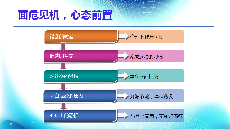 每個(gè)人要用一生的時(shí)間去修煉一種能力—抗壓能力??箟耗芰褪侨藗兏淖冏约簯峙率?、逃避行動(dòng)的消極被動(dòng)的行為習(xí)慣,擺脫挫敗、失落、無助的負(fù)面消極情緒,能回歸自我、堅(jiān)定目標(biāo)、敢于行動(dòng)的能力。它可以幫助我們在面對焦慮、緊張時(shí),保持絕對的客觀和理性,客觀認(rèn)識自己當(dāng)下的問題,并通過積極思考找到應(yīng)對策略。