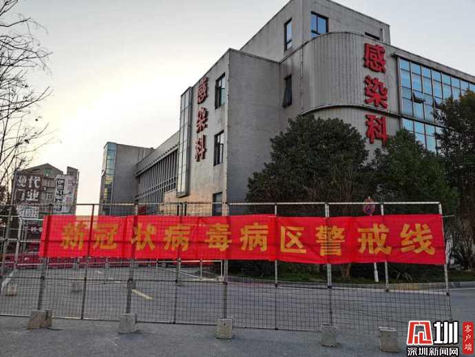 在進入大樓的通道上,設(shè)置有警戒線,寫著"新冠病毒病區(qū)警戒線"幾個大字的紅色橫幅非常醒目。