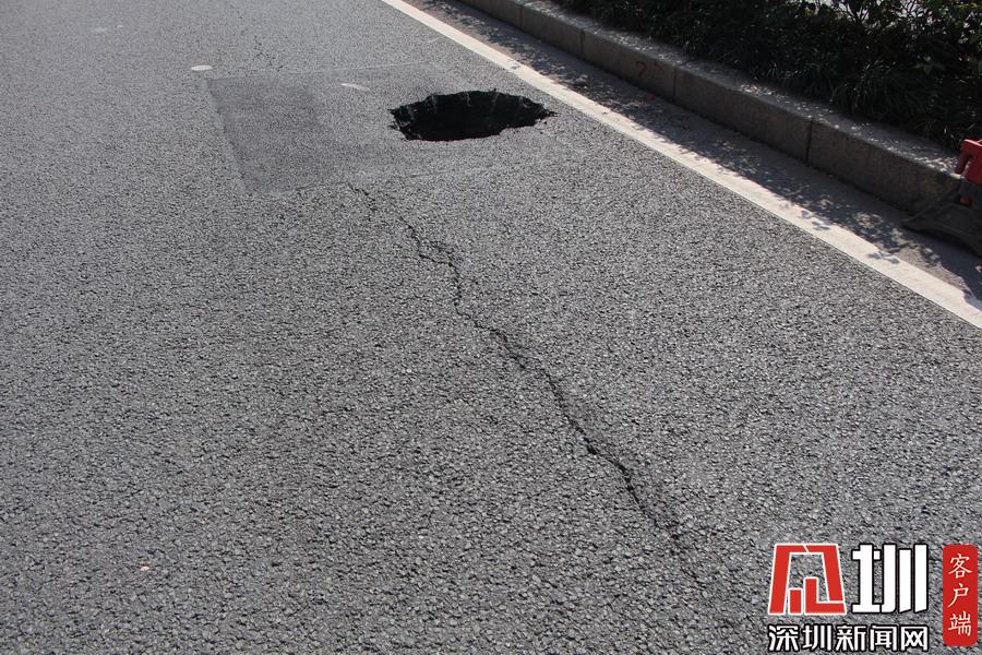 上午10點(diǎn)40分,記者在現(xiàn)場看到,該路面有一個(gè)直徑約一米、深約一米的坑口,旁邊還有一道長約20米的裂痕。工作人員正在使用雷達(dá)儀器對地面情況進(jìn)行勘測,同時(shí)該路段及靠深南大道一條車道已暫時(shí)被封鎖,福田區(qū)交警大隊(duì)也在現(xiàn)場指揮交通。據(jù)悉,該位置較臨近的地鐵2、3路線的站點(diǎn),一位深圳地鐵的工作人員告訴記者,目前該事故沒有對其線路運(yùn)行造成影響,也非先前修挖地鐵所致。
