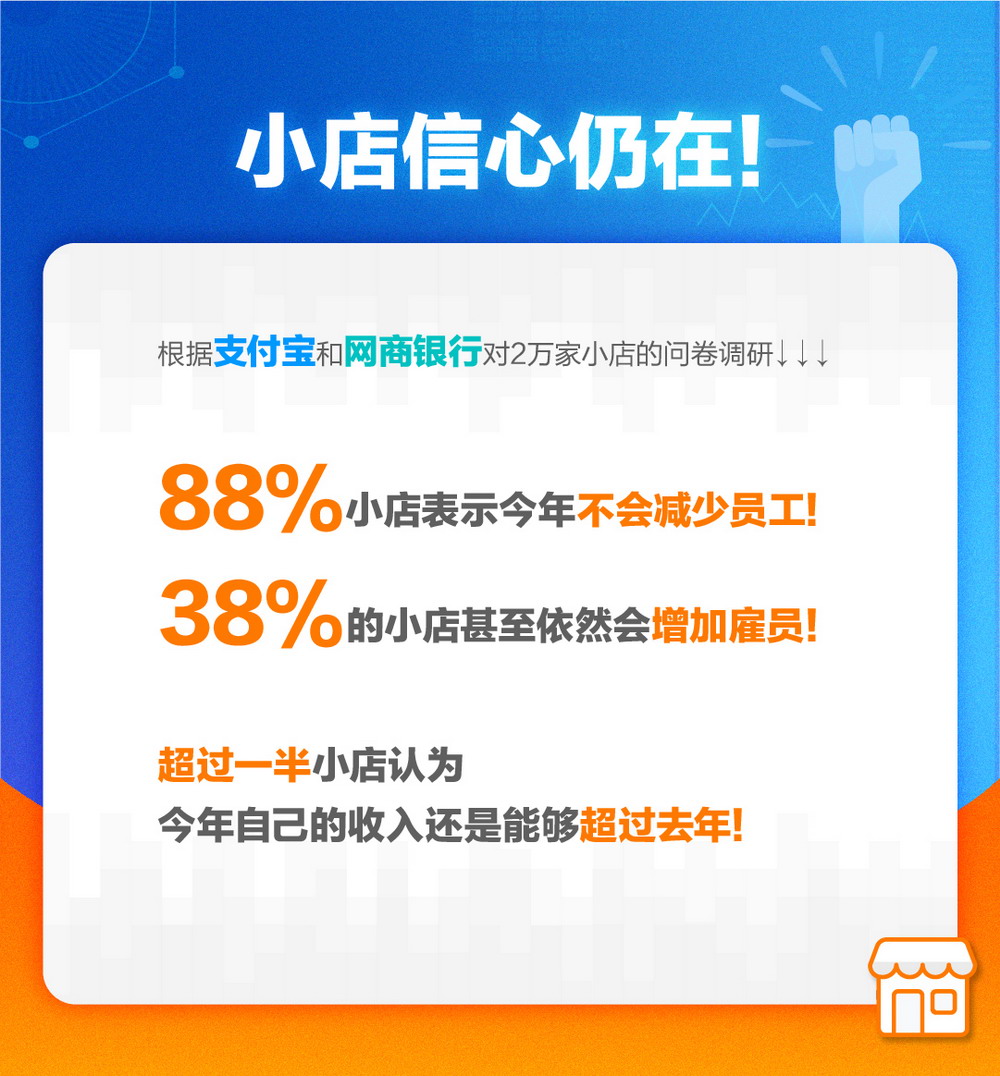 根據(jù)支付寶和網(wǎng)商銀行對(duì)20000家小店的問(wèn)卷調(diào)研,88%小店表示,今年不會(huì)減少員工,38%的小店表示,依然會(huì)增加雇員;超過(guò)一半小店認(rèn)為今年自己的收入還是能夠超過(guò)去年。