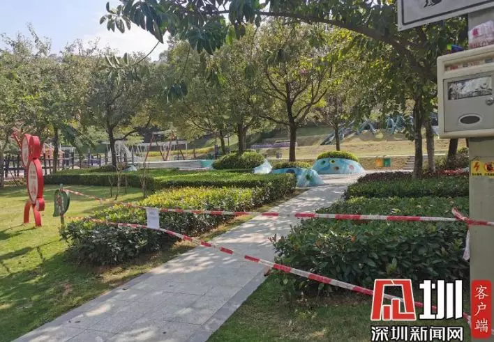 在光明區(qū)新城公園,記者看到公園里游樂設施區(qū)域已被封,暫未對外開放。道路兩旁的小喇叭正播放著防疫宣傳廣播,提醒市民出門戴好口罩,勤洗手,注意防護。