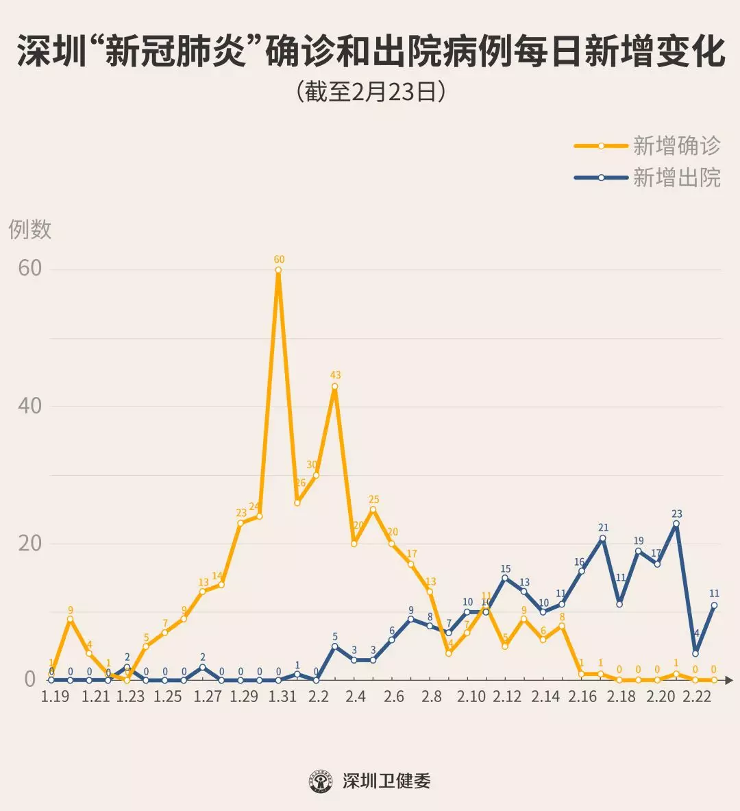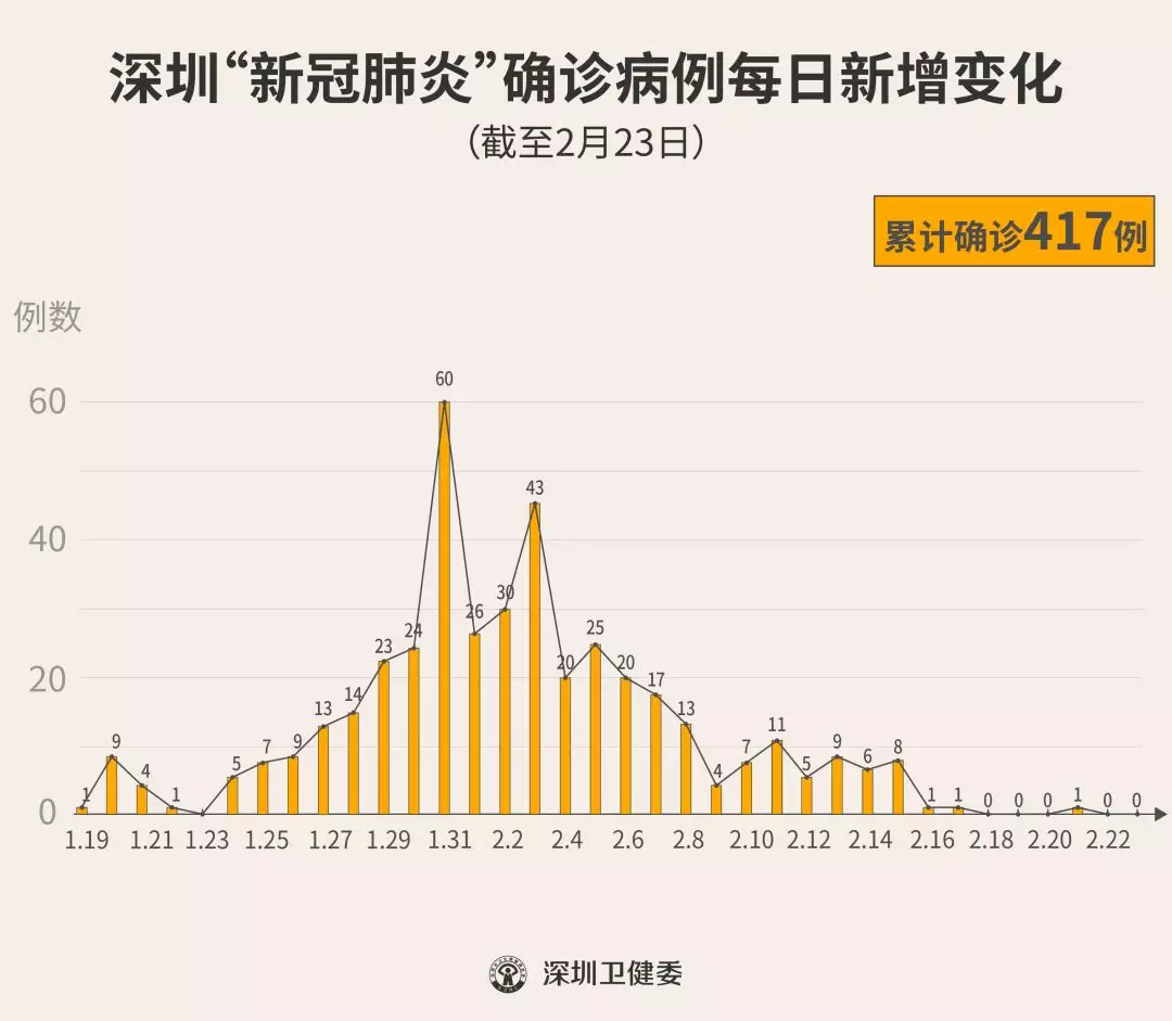 截至2月23日24時(shí),深圳累計(jì)報(bào)告“新冠肺炎”確診病例417例。2月23日當(dāng)天全市無新增確診病例。 ▲新增出院病例已超過新增確診病例 累計(jì)報(bào)告確診病例中,男性197例、女性220例。 按照病例管理地區(qū)劃分,南山區(qū)87例、福田區(qū)81例、龍崗區(qū)71例、寶安區(qū)62例、龍華區(qū)34例、羅湖區(qū)32例、光明區(qū)11例、坪山區(qū)7例、鹽田區(qū)6例、大鵬新區(qū)2例、其他(指由機(jī)場(chǎng)、車站、碼頭、關(guān)口、路卡等直接送往定點(diǎn)醫(yī)院的)24例。 目前,重癥5例、危重癥8例,死亡3例,累計(jì)出院237例。 177例確診病例均在深圳市第三人民醫(yī)院隔離治療。 159例密切接觸者正在接受醫(yī)學(xué)觀察。 資料來源:深圳市疾控中心、深圳市衛(wèi)健委、廣東省衛(wèi)健委