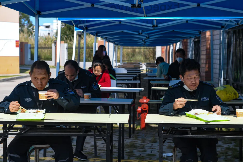 位于福城街道的泰衡諾科技有限公司園區(qū),員工在臨時(shí)“食堂”分桌就餐。