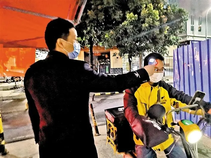 民治街道上芬社區(qū)網(wǎng)格員在卡點(diǎn)為進(jìn)出人員進(jìn)行體溫檢測(cè)。