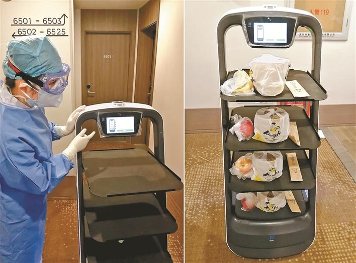 左圖是醫(yī)護人員在深圳市福田區(qū)華富街道健康驛站介紹送餐機器人;右圖是依次擺好在機器人托盤上的食物(2月7日攝)。新華社發(fā)