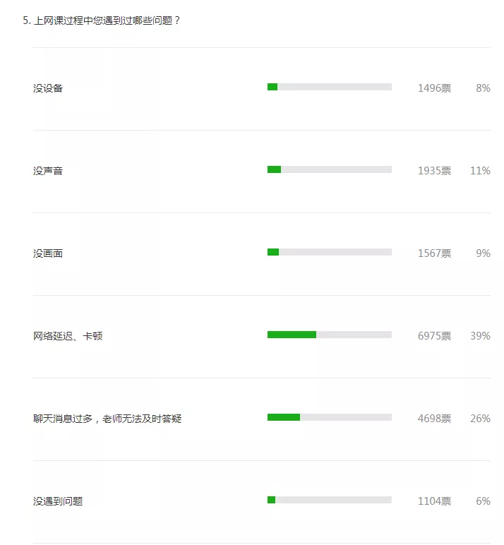 僅有6%的參與者在網課中從未遇到障礙。39%的參與者曾遇到網絡卡頓、延遲的問題,20%的參與者曾遇到網課沒聲音、沒網絡等問題。