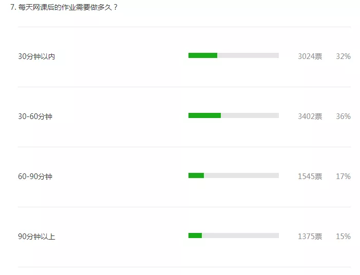 根據(jù)投票結(jié)果,68%的人認(rèn)為網(wǎng)課后的作業(yè)在60分鐘內(nèi)可以完成。不過,許多參與者認(rèn)為網(wǎng)課后的作業(yè)對(duì)于家長(zhǎng)來說負(fù)擔(dān)較重。