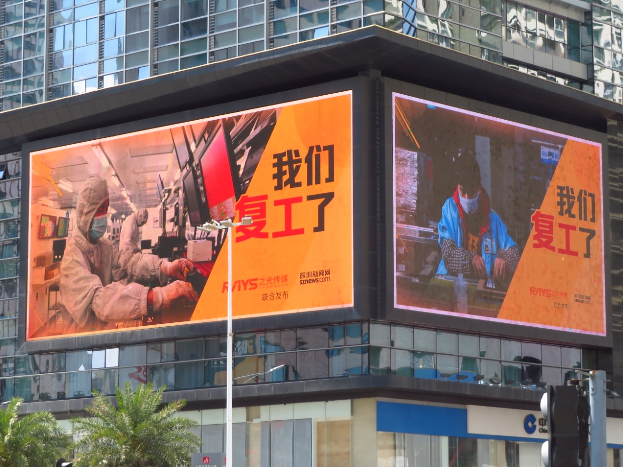 2月以來,深圳新聞網(wǎng)聯(lián)合之光傳媒在17塊戶外LED大屏廣告上刊登了多組不同主題的公益廣告,包括“加油中國(guó)”、“向逆行者致敬”、“瞞報(bào)就是犯罪”系列警示標(biāo)語、“我們復(fù)工了”等。這些戶外大屏遍布全市各主干道和核心商圈,總面積達(dá)6000㎡,市場(chǎng)價(jià)值約1200萬元。