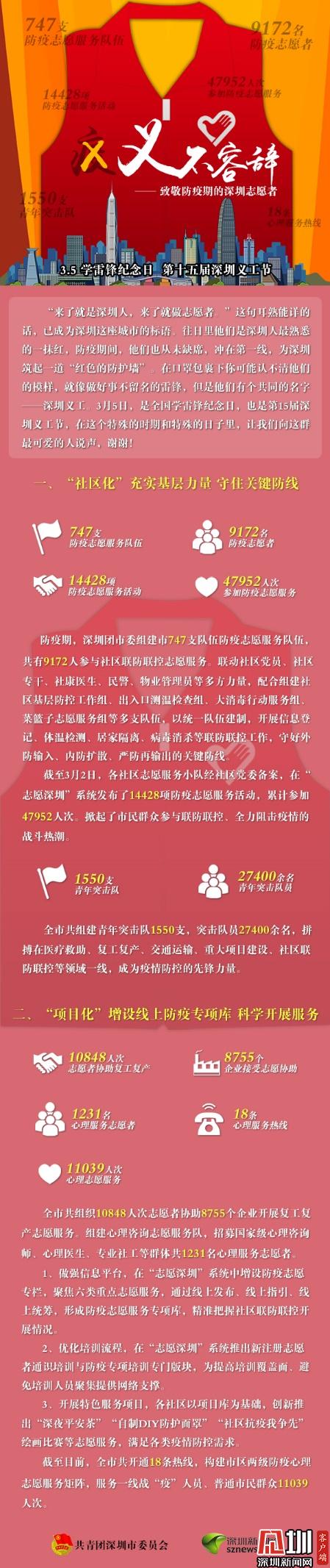 據(jù)了解,防疫期間,深圳團(tuán)市委組建747支防疫志愿服務(wù)隊伍,共9172人參與社區(qū)聯(lián)防聯(lián)控志愿服。截至3月2日,各社區(qū)志愿服務(wù)小隊經(jīng)社區(qū)黨委備案,在“志愿深圳”系統(tǒng)發(fā)布了14428項防疫志愿服務(wù)活動,累計參加47952人次。在深圳戰(zhàn)“疫”的關(guān)鍵時刻,全市共組建青年突擊隊1550支,突擊隊員27400余人,拼搏在醫(yī)療救助、復(fù)工復(fù)產(chǎn)、交通運(yùn)輸、重大項目建設(shè)、社區(qū)聯(lián)防聯(lián)控等領(lǐng)域一線,成為疫情防控的先鋒力量。