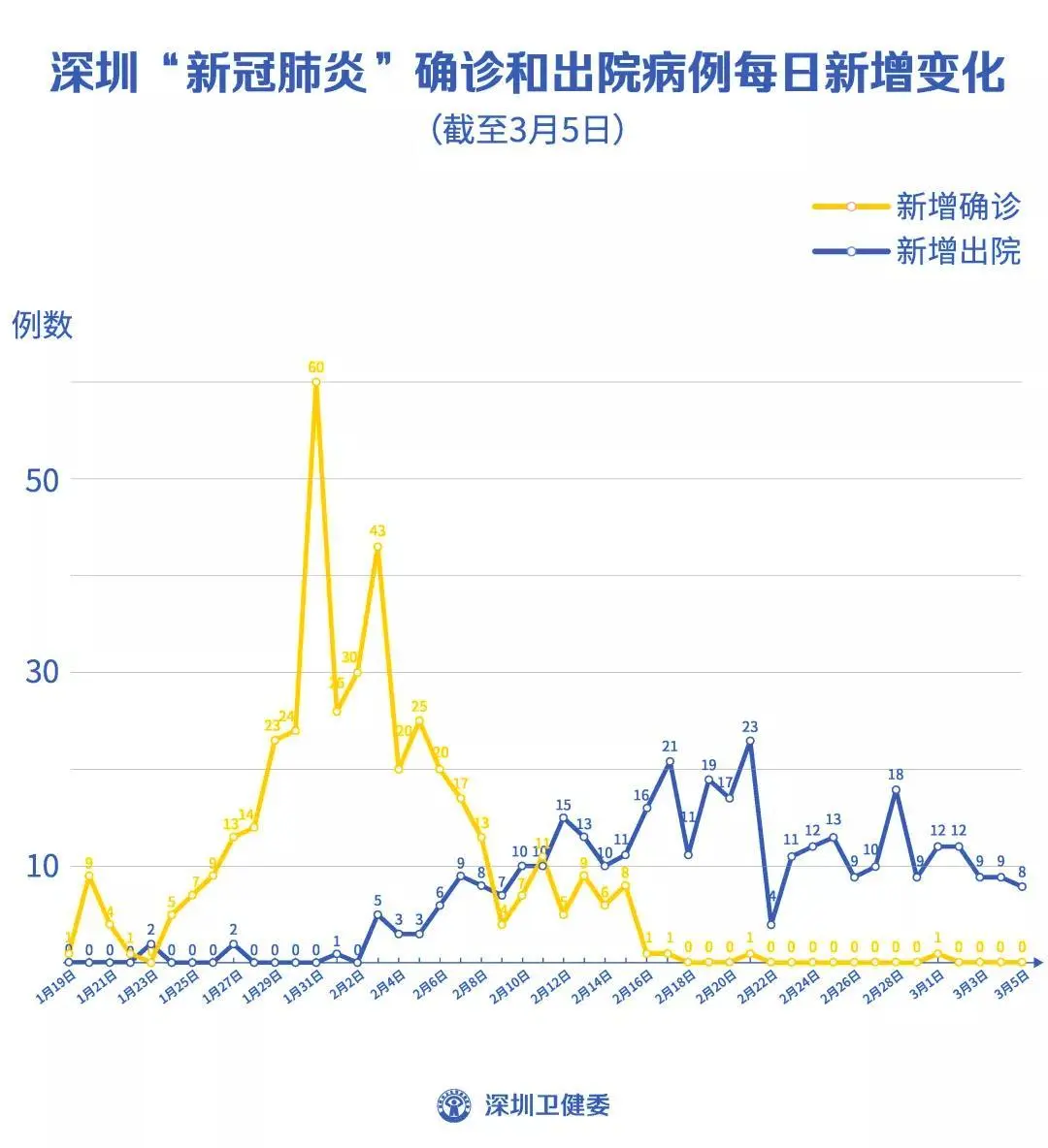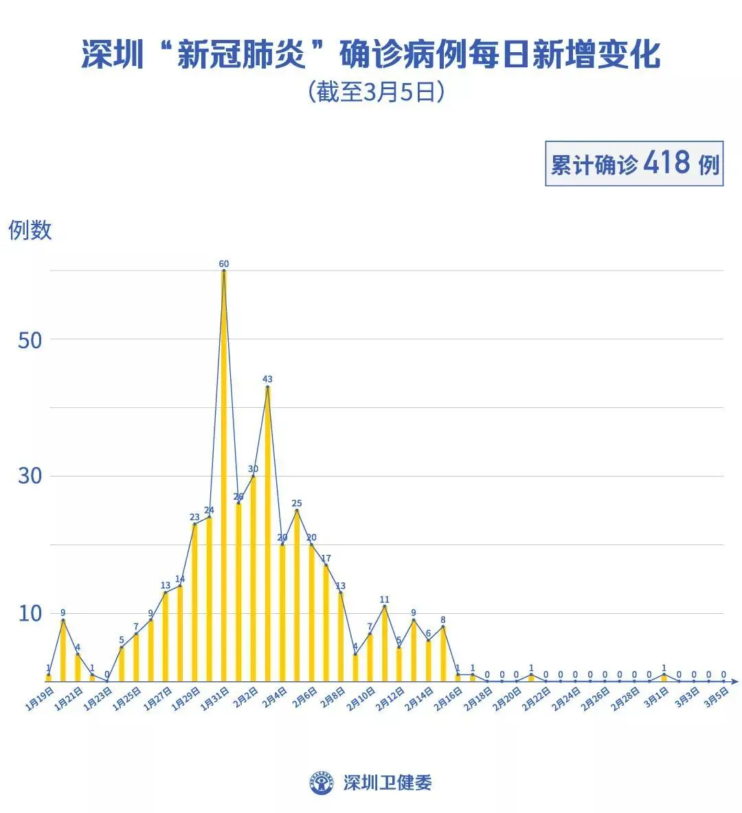截至3月5日24時,深圳累計報告“新冠肺炎”確診病例418例。3月5日當天全市無新增確診病例,當天出院病例8例(從2月26日起不再公布出院個案)。 累計報告確診病例中,男性198例、女性220例。 按照病例管理地區(qū)劃分,南山區(qū)87例、福田區(qū)82例、龍崗區(qū)71例、寶安區(qū)62例、龍華區(qū)34例、羅湖區(qū)32例、光明區(qū)11例、坪山區(qū)7例、鹽田區(qū)6例、大鵬新區(qū)2例、其他(指由機場、車站、碼頭、關(guān)口、路卡等直接送往定點醫(yī)院的)24例。 目前,重癥4例、危重癥3例,死亡3例,累計出院358例。 57例確診病例均在深圳市第三人民醫(yī)院隔離治療。 97例密切接觸者正在接受醫(yī)學觀察。 資料來源:深圳市疾控中心、深圳市衛(wèi)健委、廣東省衛(wèi)健委