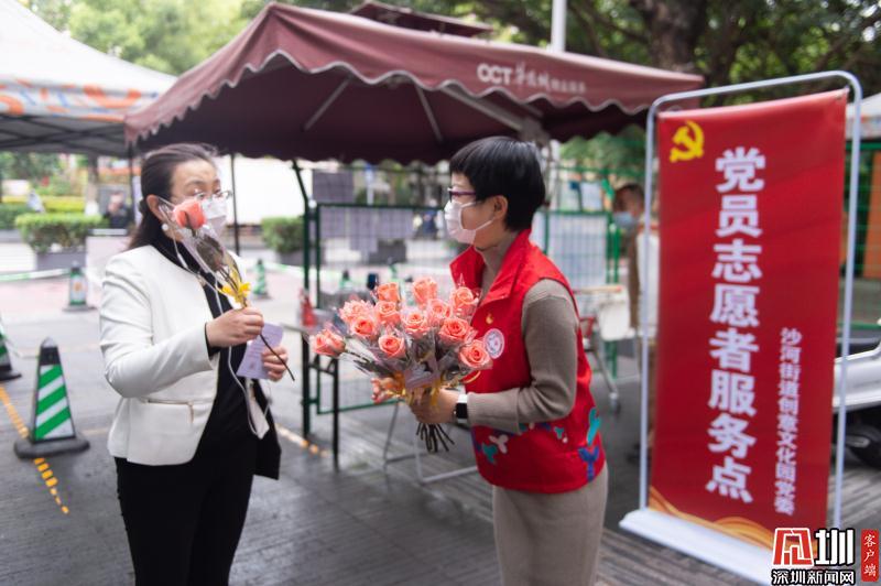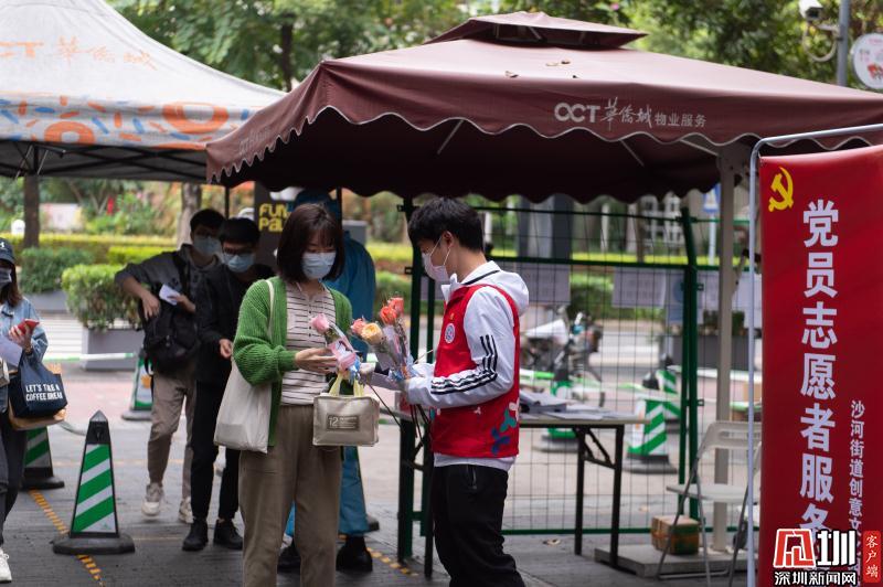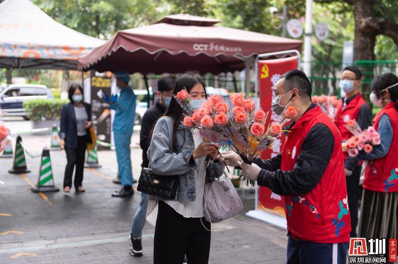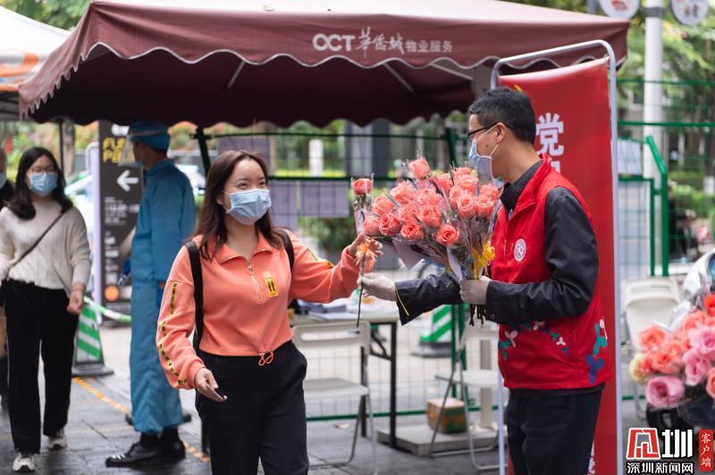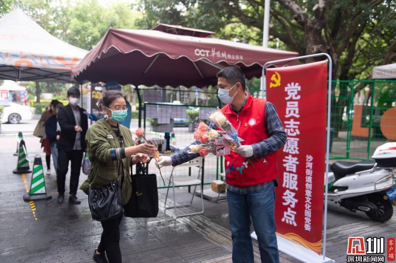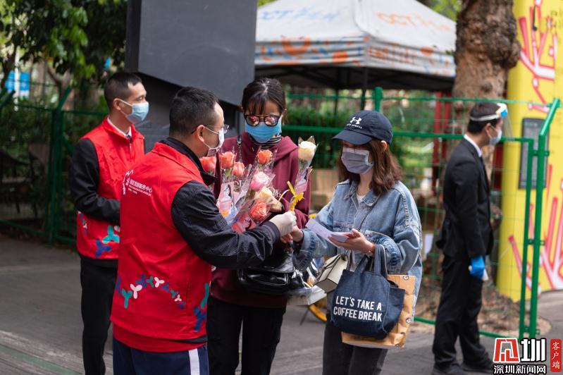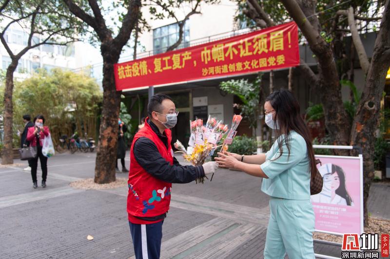 見圳客戶端·深圳新聞網2020年3月6日訊 3月6日上午,春暖花開,萬物更新。華僑城創(chuàng)意文化T街入口,進入園區(qū)上班的員工除了接受體溫檢測、出示入園卡等常規(guī)動作外,女員工意外收到了一束鮮花和一張“三八”節(jié)賀卡,賀卡上寫著:帶著溫柔堅定的力量抗“疫”前行!這是園區(qū)黨員志愿者對“抗擊疫情、復工復產”中廣大女職工的禮贊。