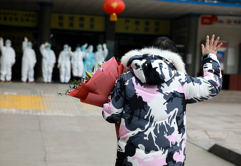 不一會兒,7名穿著防護服的醫(yī)護人員將張冬雪護送了出來。剛一露面,人群中立刻響起一陣掌聲。2位早已在大門外等候的護士激動地上前與張冬雪擁抱,段昌奉也沖上去把飽含大家祝福和關心的鮮花獻給她。張冬雪笑著向人群揮手,走了幾步后,又回頭向依然站在門口目送她的7名醫(yī)護人員深深鞠了一躬,“謝謝,謝謝你們?!?/p>
