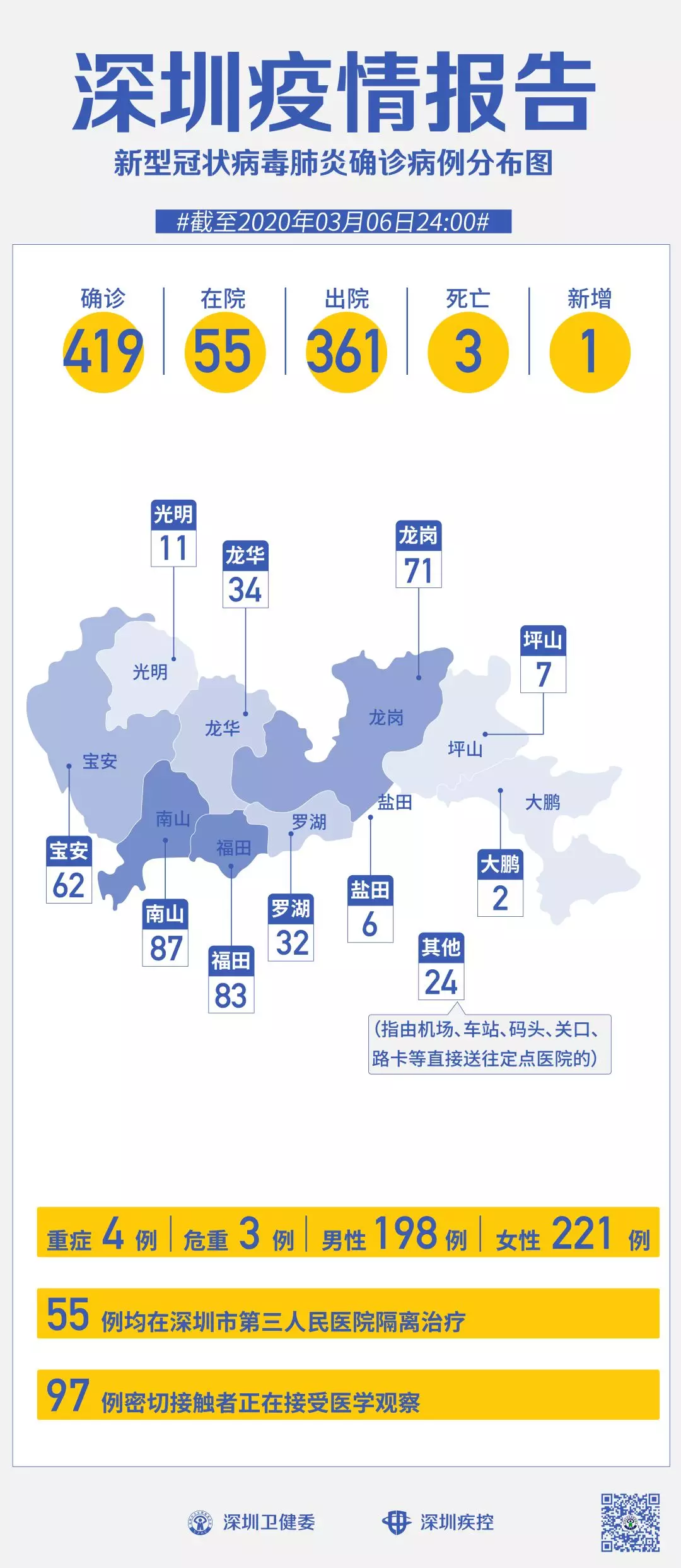截至3月6日24時(shí),深圳累計(jì)報(bào)告“新冠肺炎”確診病例419例。3月6日當(dāng)天全市新增確診病例1例,當(dāng)天出院病例3例(從2月26日起不再公布出院個(gè)案)。
