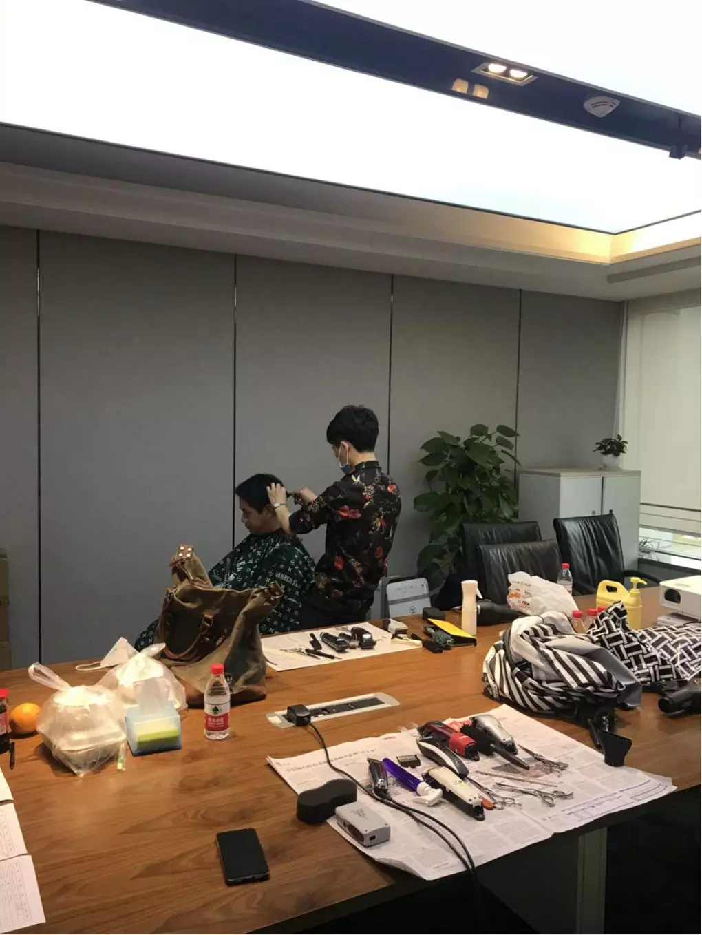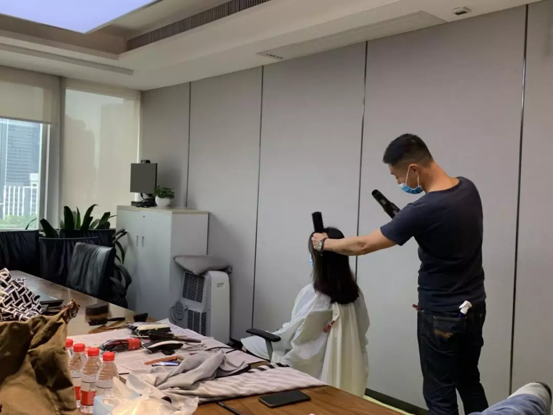 公司本部,1303會議室,臨時理發(fā)室“生意”也火爆極了。公司工會邀請了兩名專業(yè)的Tony老師,為近90名員工提供免費的理發(fā)服務。為減少人員聚集,理發(fā)采取提前線上預約,分時段進行,確保安全的同時,盡可能讓有需要的同事都能理上發(fā)。鋪上一次性地毯,坐上椅子,圍上一次性“斗篷”,Tony老師一頓熟練的剪發(fā)操作后,再用吹風機整好造型,就完成了理發(fā)的全過程。臨時理發(fā)師的搭建,有效解決了員工生活上的困難,幫助他們以良好的精神面貌投入工作來。