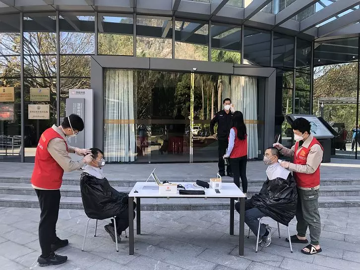二月二,龍?zhí)ь^,一把椅子、一面鏡子、一套剃發(fā)工具,鹽田能源生態(tài)園的簡易理發(fā)室開張啦。防疫先鋒戰(zhàn)斗隊五人義剪小分隊隨即開始行動,對理發(fā)室開啟自然通風,對理發(fā)用具進行消毒,清潔雙手,全部使用一次性“斗篷”,確保理發(fā)過程中一“客”一換一消毒……準備工作做好后,Tony老師開啟微信排號,統(tǒng)一戴上口罩,測量體溫登記后,提拉剪推,一氣呵成。本次義剪為30余名員工解決了“頭”大事,大家“輕裝上陣”,將以更飽滿的精神投入到疫情防控和安全生產(chǎn)工作中。