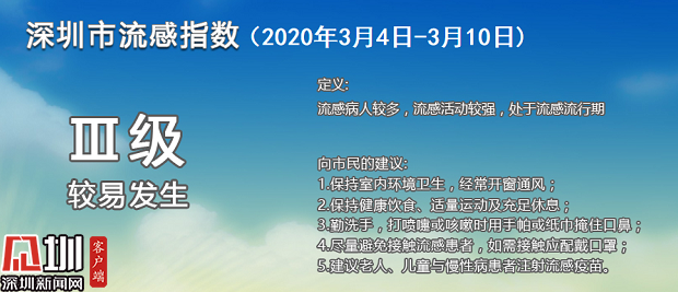 見(jiàn)圳客戶(hù)端·深圳新聞網(wǎng)2020年3月9日訊(見(jiàn)圳客戶(hù)端、深圳新聞網(wǎng)記者 劉夢(mèng)婷)根據(jù)深圳市疾控中心公布的深圳市流感指數(shù),3月份以來(lái),深圳均顯示為Ⅲ級(jí)(較易發(fā)生),目前深圳處于流感流行期,流感活動(dòng)較強(qiáng),流感病人較多。
