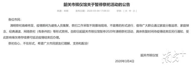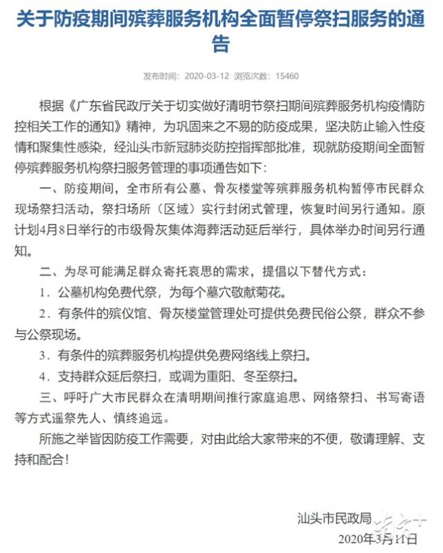 據(jù)統(tǒng)計,截至3月15日17時,深圳、汕頭、中山等地發(fā)文明確,全市暫停祭掃服務(wù),倡導(dǎo)通過家庭追思、網(wǎng)絡(luò)祭掃、書寫寄語等方式遙祭先人、慎終追遠。此外,韶關(guān)市殯儀館暫停2020年清明祭祀活動。