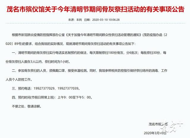 茂名市殯儀館提供限制性祭掃服務(wù),清明節(jié)期間的骨灰祭掃實行電話實名制預(yù)約,每天限制祭掃180份骨灰,分6批次;每批祭掃30份,每份骨灰祭掃人數(shù)在3人以內(nèi),祭掃時間為1小時。
