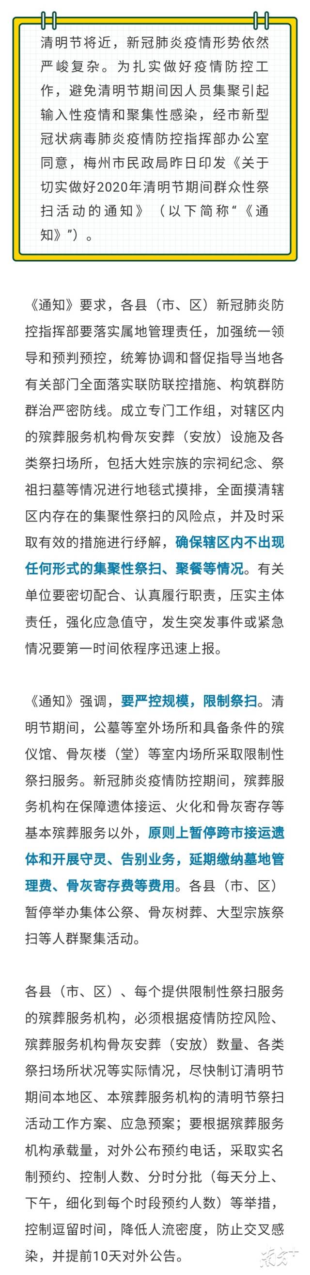根據(jù)要求,廣東暫停舉辦集體公祭、骨灰海葬、骨灰樹葬等人群聚集活動。各地級以上市新冠肺炎防控指揮部要盡快研究決定清明節(jié)期間本地區(qū)殯葬服務(wù)機構(gòu)暫?;蛘呦拗萍罀叻?wù),并對外公告。疫情防控風(fēng)險較高的,暫停祭掃服務(wù);具備條件且防控措施落實到位的,可提供限制性祭掃服務(wù)。