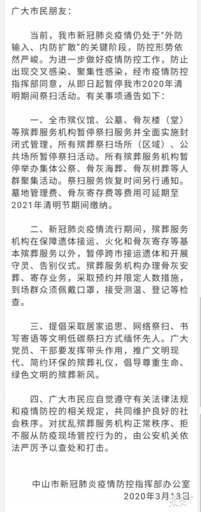 中山全市所有殯葬祭掃場所(區(qū)域)、公共場所暫停祭掃活動。殯葬服務(wù)機構(gòu)辦理骨灰安葬、寄存業(yè)務(wù),采取預(yù)約并限定人數(shù)措施。
