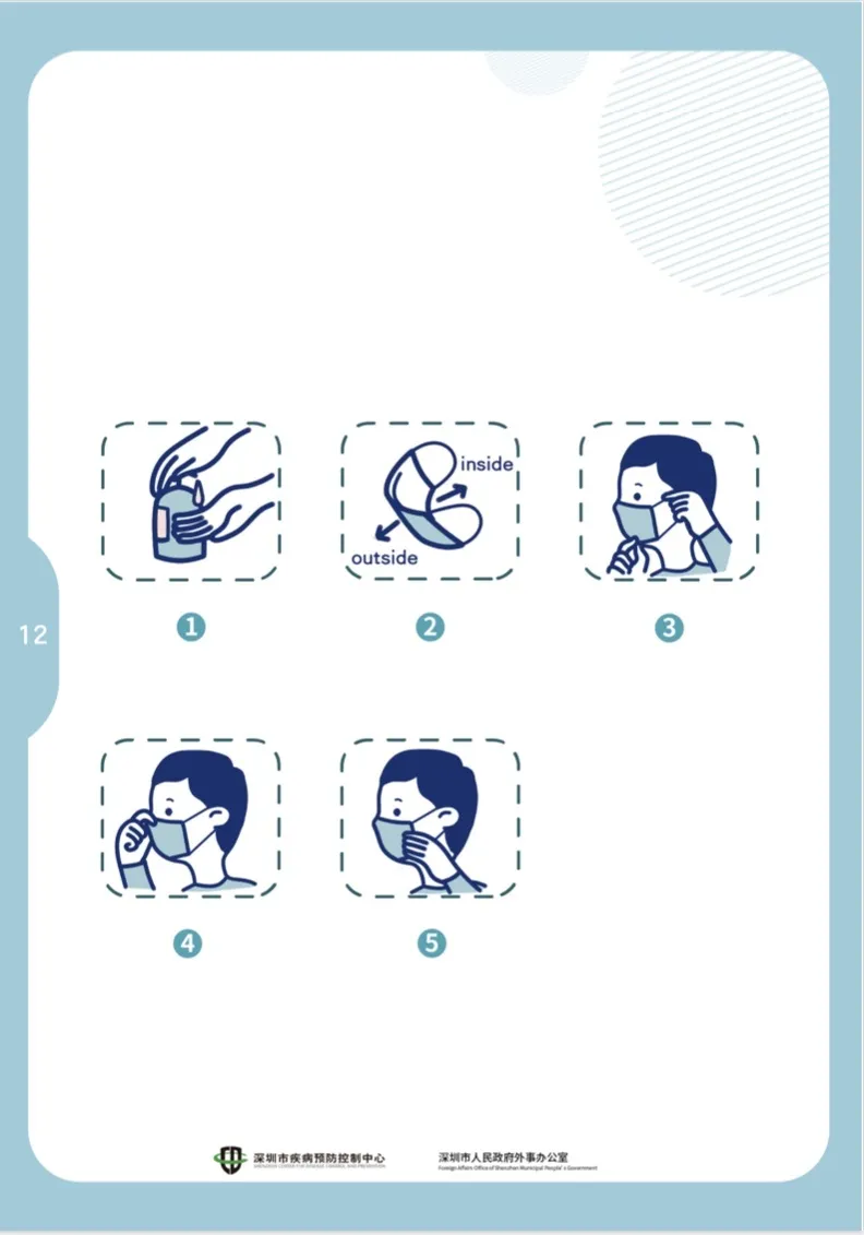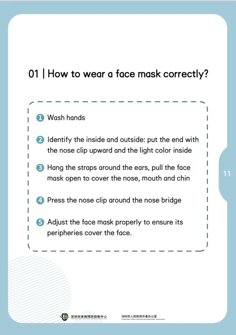 首先洗手——確認內外:有鼻夾的一端朝上,淺色一面朝自己——將掛繩繞在耳朵上,拉開口罩,把鼻、口、下巴罩好——把鼻夾沿鼻梁處貼緊——適當調整口罩,使口罩周邊充分貼合面部。