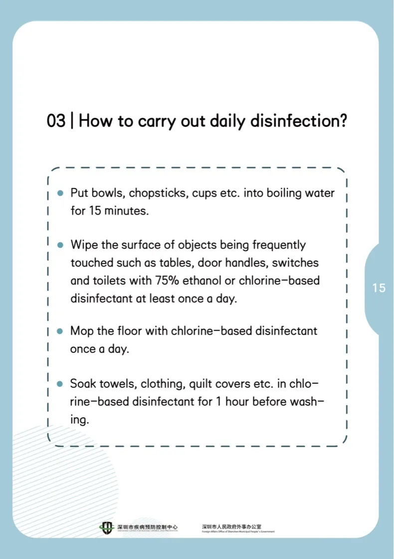 臺面、門把手、開關、馬桶等常接觸使用的物品表面,每天至少用75%酒精或含氯消毒劑擦拭一次。