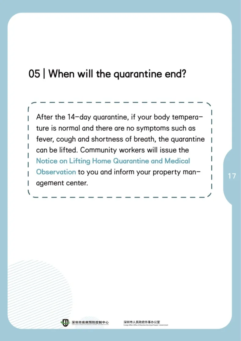 隔離滿14天后,如果體溫正常,無發(fā)熱、咳嗽、氣促這些癥狀,就可以解除隔離了。社區(qū)工作人員會發(fā)放《解除居家隔離醫(yī)學觀察告知書》,并通知物業(yè)。