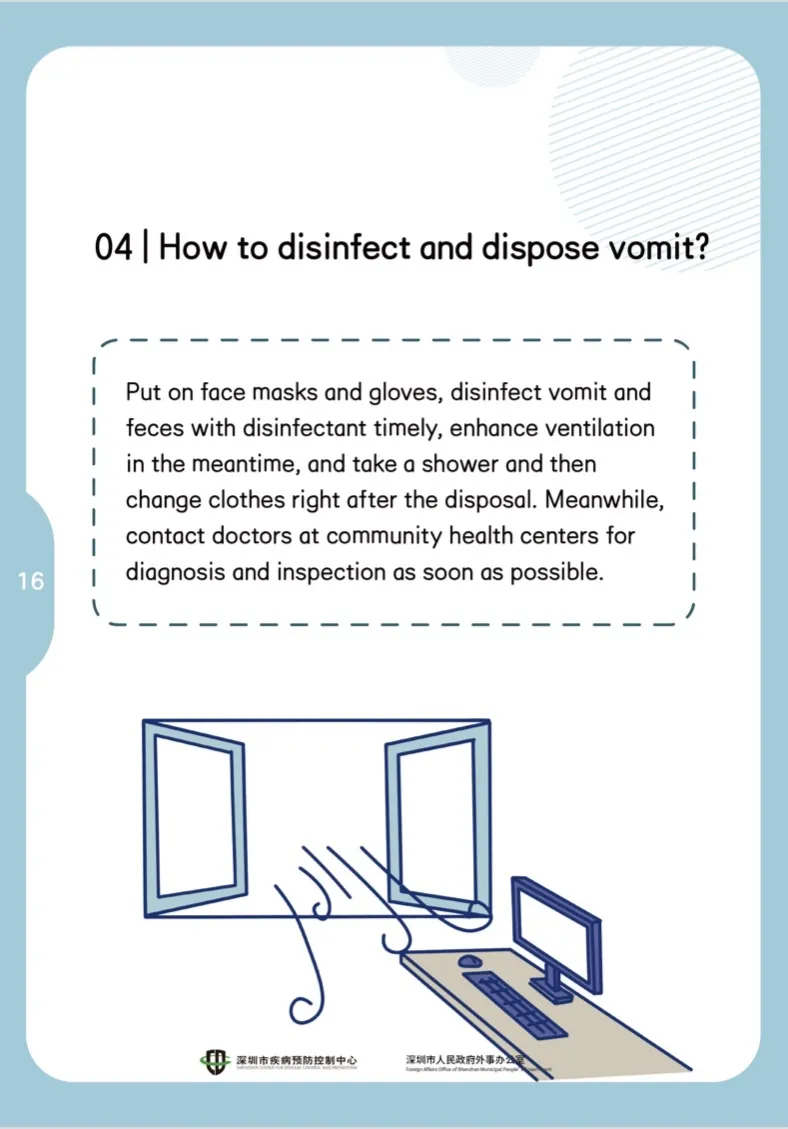 戴上口罩及手套,及時用消毒液對嘔吐物、排泄物進行消毒,同時加強通風,處理完后及時洗浴更換衣物。同時盡快聯(lián)系社康醫(yī)生進行診查。