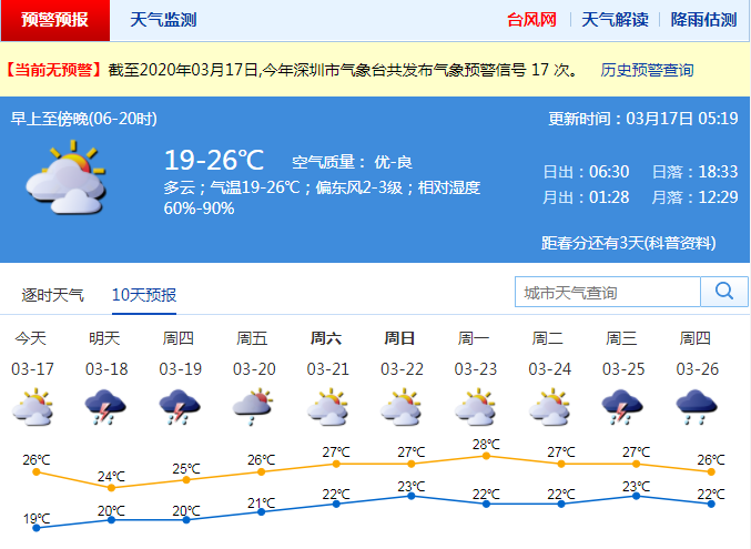 見(jiàn)圳客戶端·深圳新聞網(wǎng)2020年3月17日訊 深圳17日回暖增濕,18-19日有雷陣雨。17日可見(jiàn)陽(yáng)光,早晚有輕霧,19-26℃;18-19日多云到陰天,有雷陣雨局部大雨;20-23日溫暖濕潤(rùn),早晚有輕霧或霧。