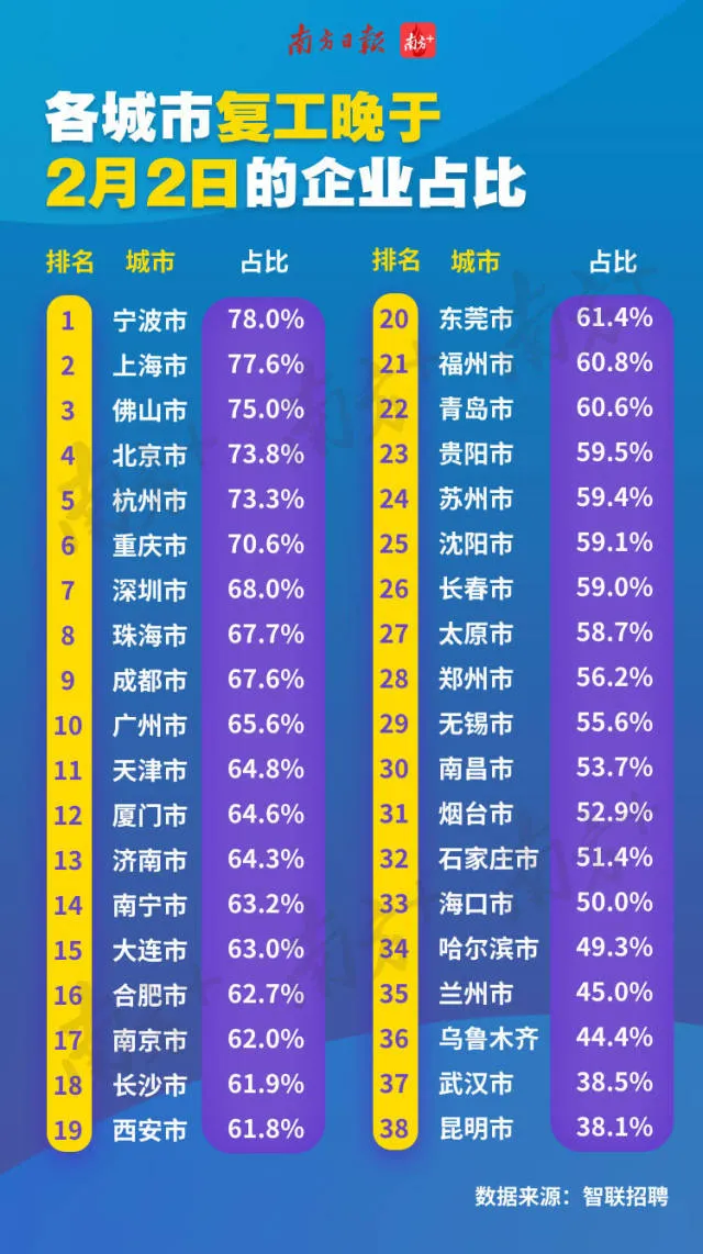同樣根據這份《報告》,全國各城市晚于2月2日復工的企業(yè)占比統計排名顯示,前10名中9個城市均為南方城市,寧波企業(yè)延遲復工響應度最高,確定2月2日后復工的企業(yè)占比達到了78%。前10名中4個為廣東城市,分別是佛山、深圳、珠海、廣州。