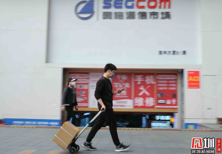 3月16日下午,賽格通訊市場(chǎng)門口,一名拉著小推車的人經(jīng)過(guò)。