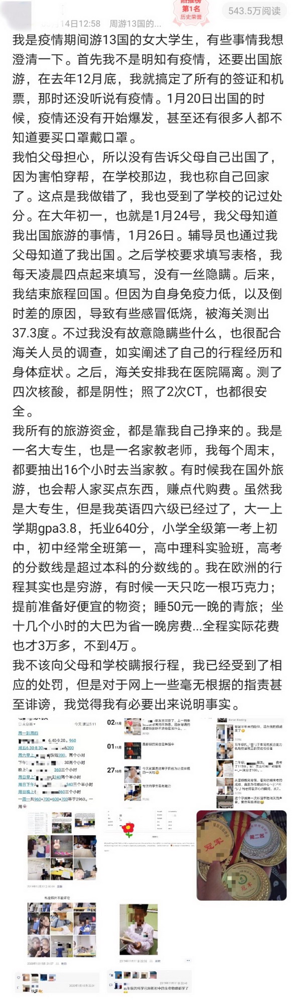 見(jiàn)圳客戶(hù)端·深圳新聞網(wǎng)2020年3月20日訊 近日,一位深圳女大學(xué)生小Y瞞著父母出游13國(guó),回國(guó)后因發(fā)熱被隔離并因未如實(shí)向?qū)W校匯報(bào)行程被處分,此事引發(fā)社會(huì)關(guān)注。3月18日,當(dāng)事人接受深圳新聞網(wǎng)記者采訪,詳述事件經(jīng)過(guò)并表達(dá)悔意。
