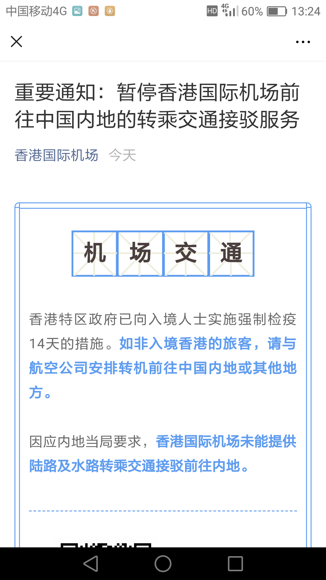 22日早間,來自香港國際機場的消息稱,香港特區(qū)政府已向入境人士實施強制檢疫14天措施,香港國際機場將不能提供陸路及水路轉乘交通接駁前往內(nèi)地。