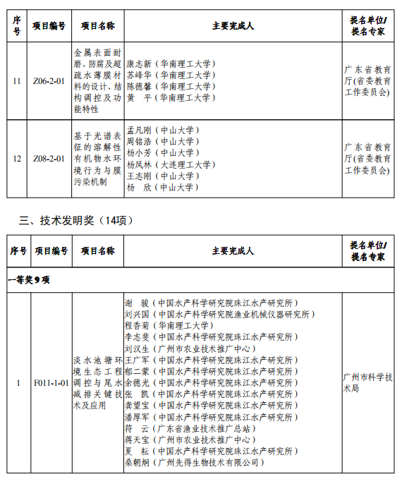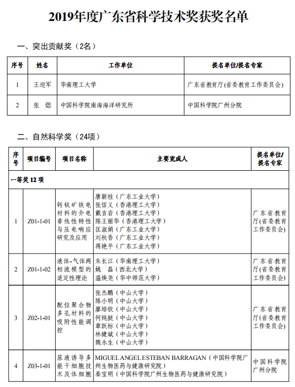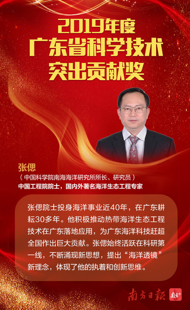 其中,2019年度廣東省科學(xué)技術(shù)突出貢獻(xiàn)獎(jiǎng)的獲獎(jiǎng)?wù)叻謩e為:中國工程院院士、亞太材料科學(xué)院院士、華南理工大學(xué)教授王迎軍;中國工程院院士,國內(nèi)外著名海洋生態(tài)工程專家,中科院南海海洋研究所所長、研究員張偲。