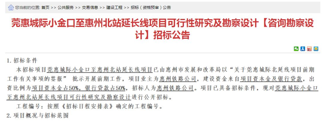 公告顯示,莞惠城際小金口至惠州北站延長線正進(jìn)行可行性研究及勘察設(shè)計招標(biāo),招標(biāo)金額為7452.47萬元(含稅價)。
