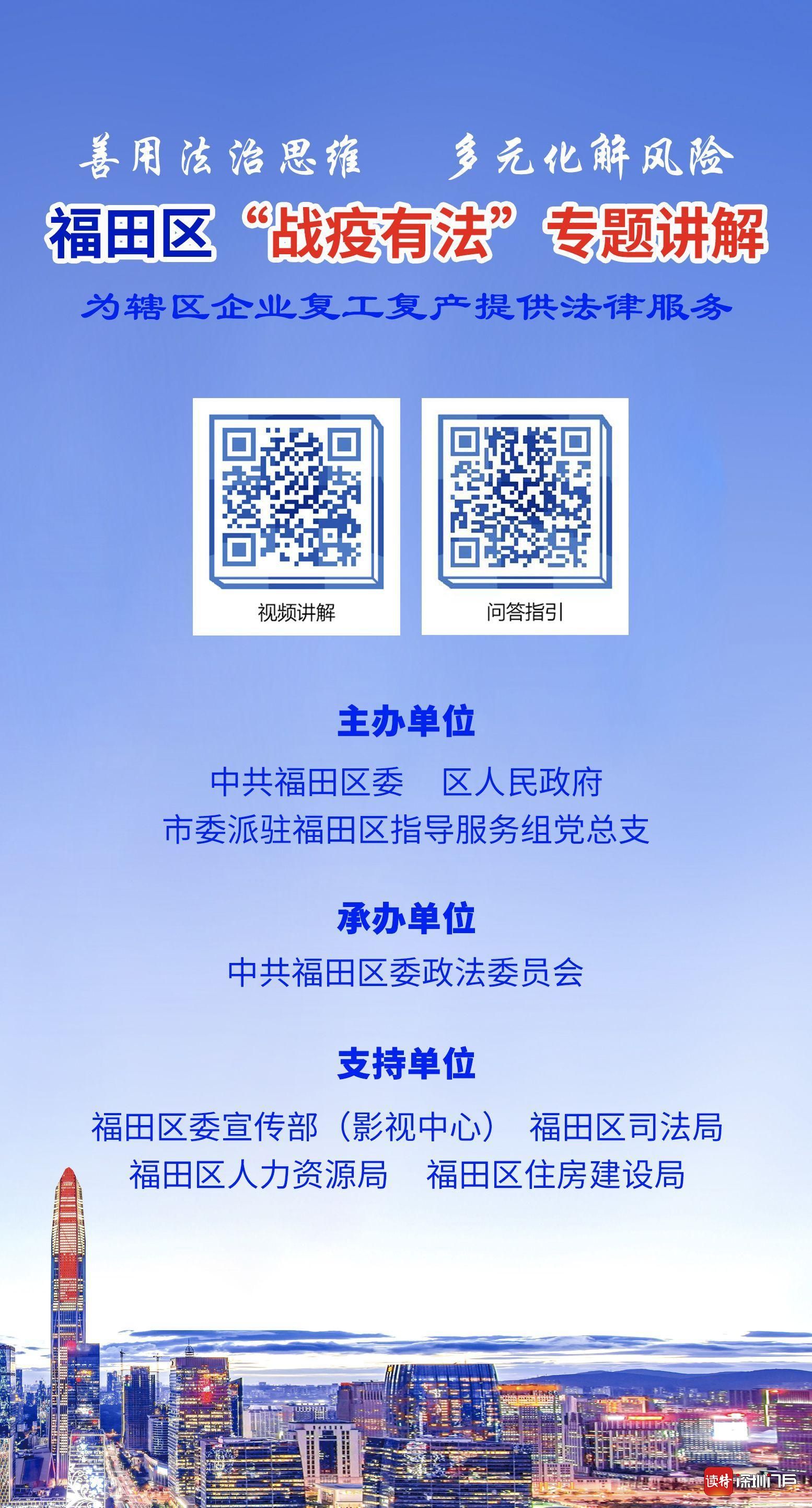 據(jù)悉,福田區(qū)“戰(zhàn)疫有法1+10”行動”是福田區(qū)委區(qū)政府和市委派駐福田區(qū)指導(dǎo)服務(wù)組黨總支組織策劃,區(qū)委政法委牽頭實施,結(jié)合市統(tǒng)一開展的“戰(zhàn)疫有法”行動,落實“依法防疫”要求,整合區(qū)委宣傳部、區(qū)司法局、區(qū)人力資源局、區(qū)住建局等相關(guān)部門、各街道和各法律服務(wù)團(tuán)相關(guān)資源,指導(dǎo)和幫助福田區(qū)企業(yè)解決復(fù)工復(fù)產(chǎn)過程中面臨的法律風(fēng)險問題。