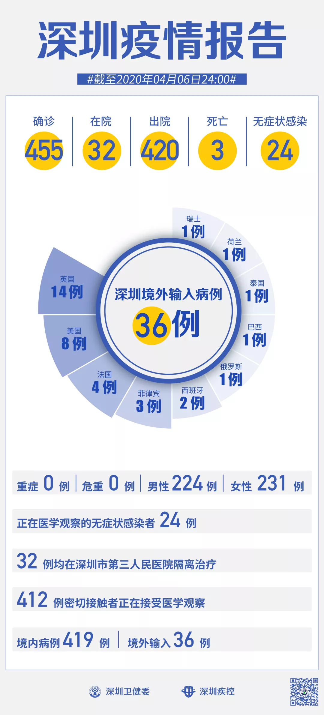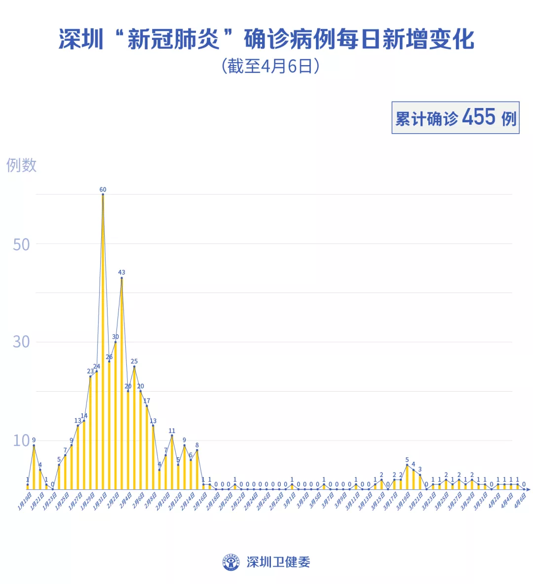 截至4月6日24時,深圳累計報告新冠肺炎病例455例。4月6日當天新增無癥狀感染者1例。