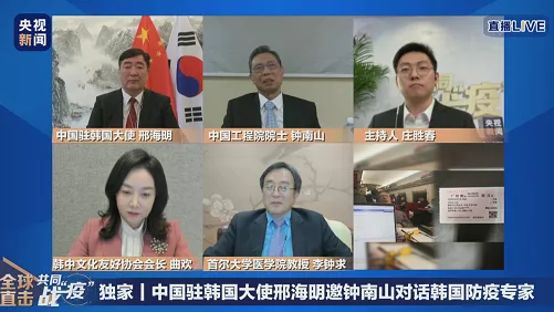 4月10日15時(shí),中國(guó)駐韓國(guó)大使邢海明邀請(qǐng)鐘南山院士與韓國(guó)防疫專(zhuān)家李鐘求教授在線交流。鐘南山專(zhuān)門(mén)制作了一個(gè)題為“抗擊新冠肺炎的中國(guó)經(jīng)驗(yàn)”的PPT,向韓國(guó)朋友介紹中國(guó)經(jīng)驗(yàn)。