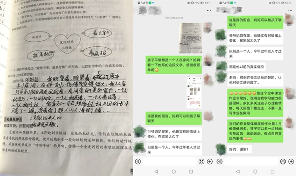 疫情來(lái)的迅猛又猝不及防,老師們一方面要完成教學(xué)任務(wù)、引導(dǎo)學(xué)生做好防疫,一方面要時(shí)刻關(guān)注學(xué)生的心理健康。學(xué)生們被迫在家度過(guò)了一個(gè)史上最長(zhǎng)的寒假,對(duì)于處在叛逆期的孩子們來(lái)說(shuō),難免會(huì)與家人出現(xiàn)一些矛盾,在課堂之外,老師們還需要擔(dān)任“心理調(diào)節(jié)師”的角色。一次,周老師班上有個(gè)同學(xué)因?yàn)樯暇W(wǎng)課的事情與父母鬧了矛盾,一氣之下跑到奶奶家,周老師得知了這件事情,第一時(shí)間聯(lián)系上學(xué)生,通過(guò)鼓勵(lì)、引導(dǎo),讓學(xué)生認(rèn)識(shí)到自己的錯(cuò)誤,與父母和解。還有一次,周老師通過(guò)批改作業(yè),發(fā)現(xiàn)一名學(xué)生在作業(yè)中吐露了自己孤獨(dú)、無(wú)趣的心聲。看到后,周老師立刻與家長(zhǎng)溝通了解情況,并建議家長(zhǎng)多多陪伴孩子。盡管老師和學(xué)生們不能在學(xué)校的課堂上相聚,但在通訊十分發(fā)達(dá)的現(xiàn)在,老師們也始終用自己的方式陪伴在學(xué)生左右。