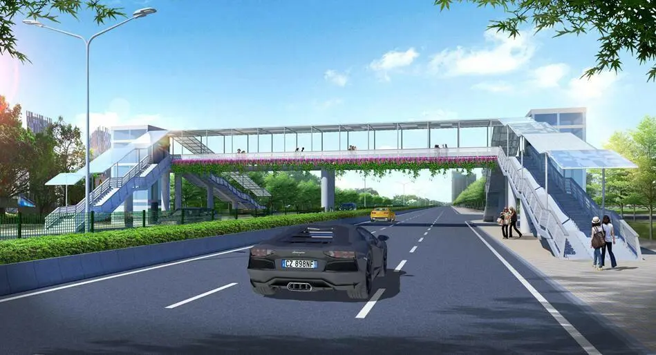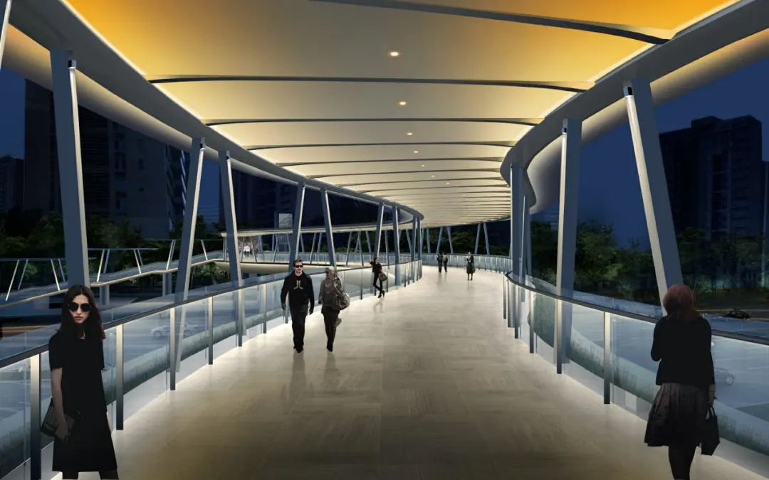 跨越南山區(qū)沙河西路,西接大沖片區(qū),東接沙河西生態(tài)長廊,橋長約113米,橋面凈寬約4.3米,主橋共4跨。天橋設(shè)計容景觀、造型、燈光、周邊環(huán)境于一體,設(shè)置無障礙觀光電梯,采用鋼箱梁及花崗巖面磚鋪裝、綠化自動滴灌等。天橋的建設(shè)將大大縮短居民繞行時間,對完善周邊居民出行環(huán)境具有重要意義。